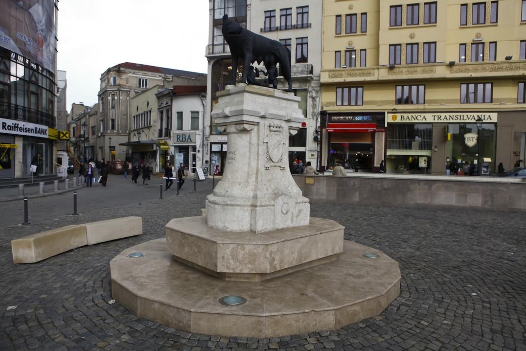 A fost primit în dar de municipalitatea bucureşteană în 1906, din partea oraşului Roma. Reprezintă lupoaica legendară care i-ar fi alăptat pe întemeietorii Romei, Romulus şi Remus, pe când erau copii. Monumentul a fost amplasat iniţial în Piaţa 1848 dar, după o serie de mutări (Piaţa Dorobanţi, Piaţa Romană), a fost amplasat pe Bd. I.C. Brătianu, la intersecţia cu Str. Lipscani. Monumentul are, pe o latură, o stemă cu iniţialele S.P.Q.R. (Senatus Populusque Romanus = Senatul şi poporul roman) iar pe cealaltă latură o stemă cu un soldat roman.